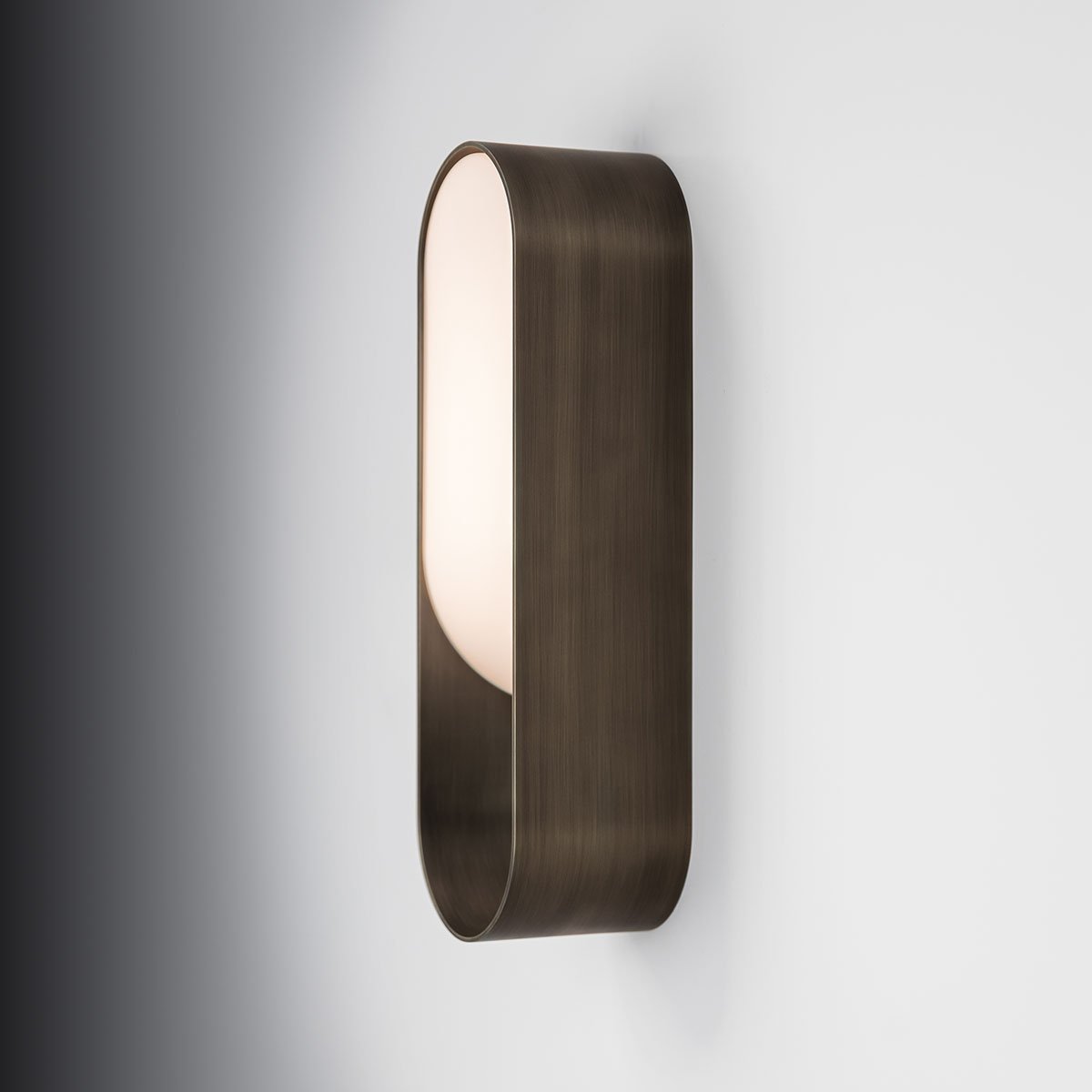 A hand-finished loop of brass cradles a gently sloping white cased glass diffuser.