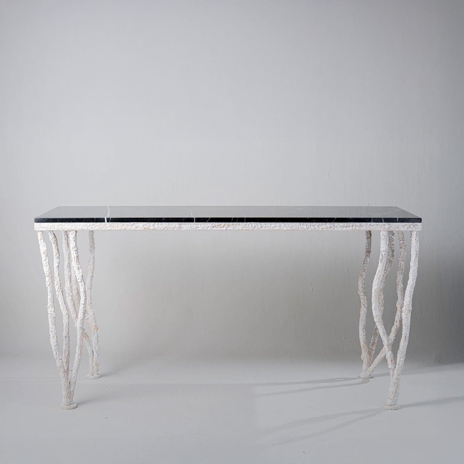 Details: The free-standing console table, Kitty. Designed with organic and textured forged steel legs. Can be made to order in any custom size or painted finish.