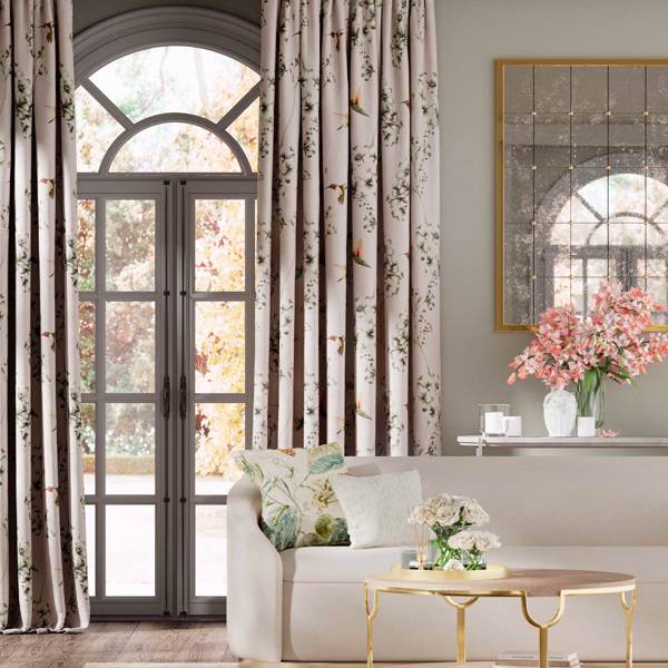 Description: A combination of hand-drawn botanical etchings and beautifully coloured hummingbirds adorn this graceful fabric, from deep Indigo blues to soft Powder pinks.