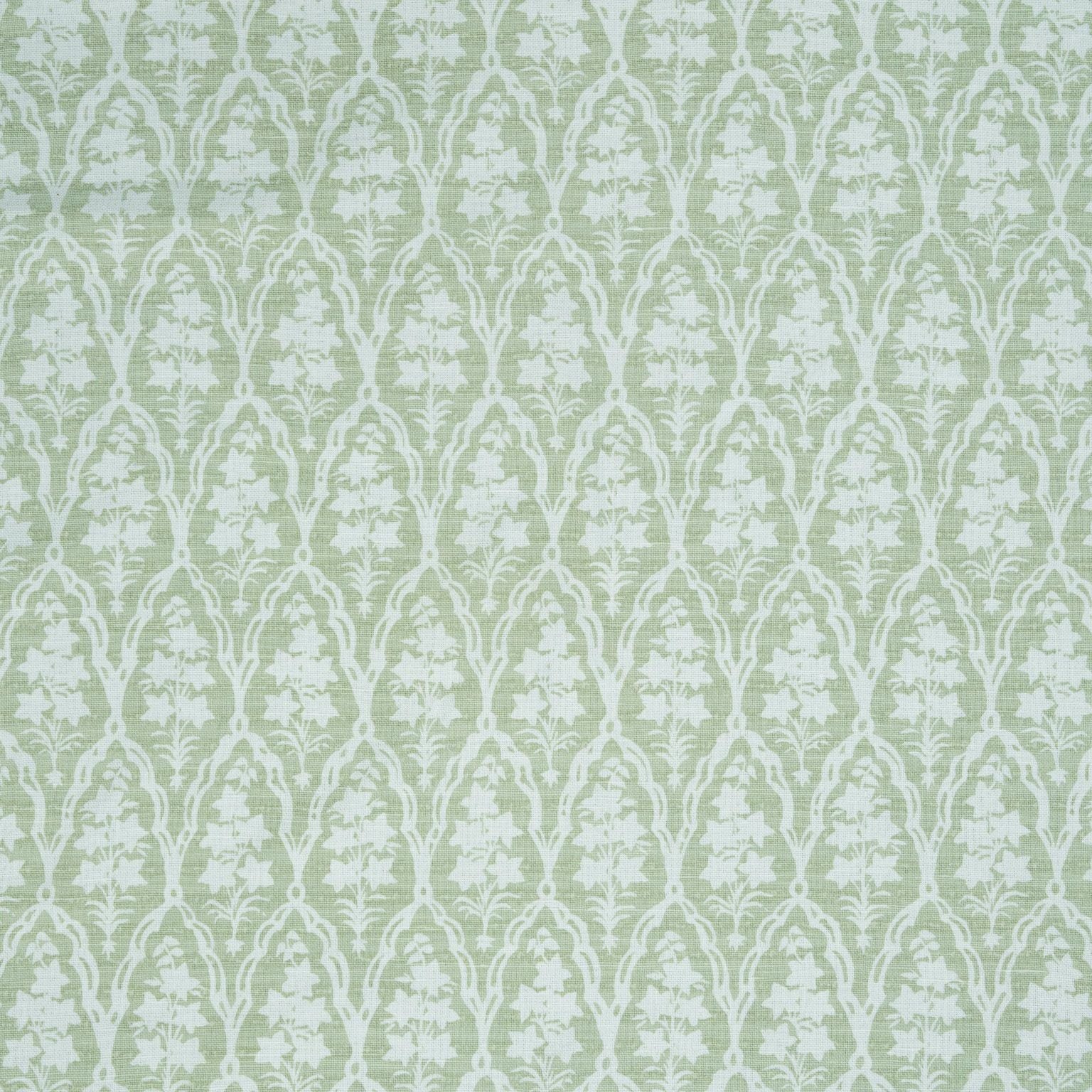 Details: Stylised campanula flowers are silhouetted within an intricate Indian trellis motif and hand block printed on a sturdy ground. Its a modern take on a traditional theme.