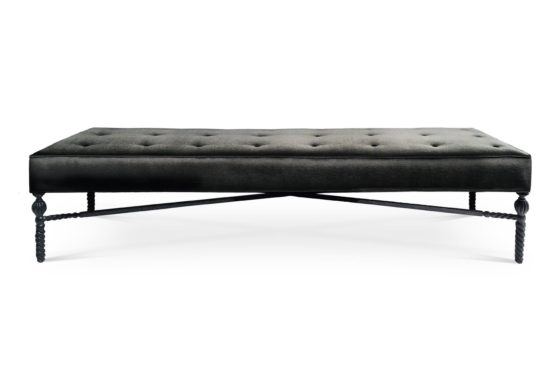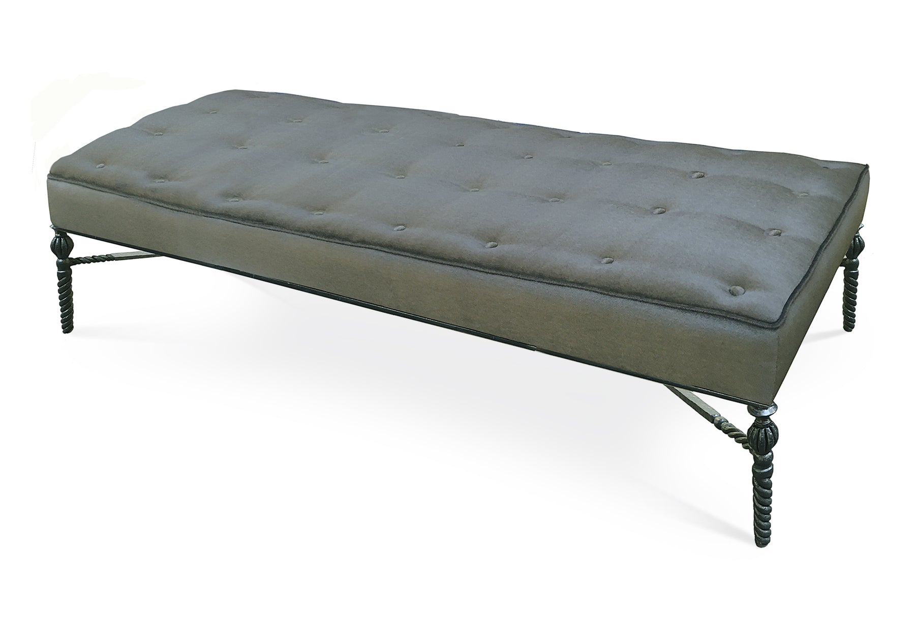 Details: Hand forged iron frame with hammered texture, botanbical detail, upholstered seat with tufting. Dimensions: 78. 25" x 30"d x 17. 75"h. Seat height: 18". Com yardage: 3. 5 yards. Available in forge, painted bronze. Trim: clean, welt.