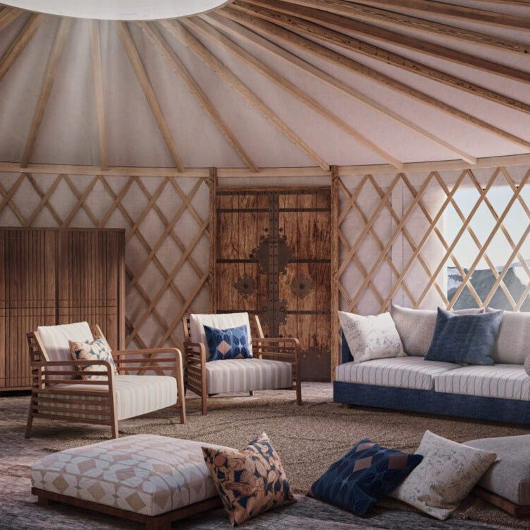 Details: The typical rounded tent which is the dwelling of many nomadic peoples of Asia, in particular Mongolia. Yurts are easily portable, insulated with wools and decorated with vibrant colourways and patterns typical of oriental religions. Yurta is an indoor-outdoor print in solution-dyed acrylic, available in 3 colorways.