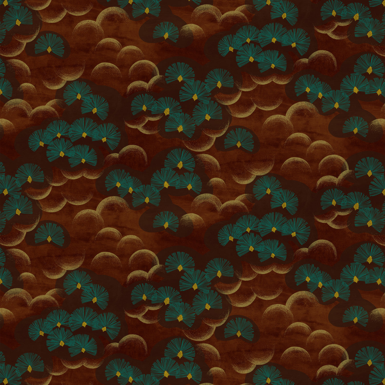 Description: Lily Pond is a Japanese-inspired velvet print: small crescents of light play and sublimate a ballet of stylized water lilies, floating on a patina where the sky and clouds are reflected.