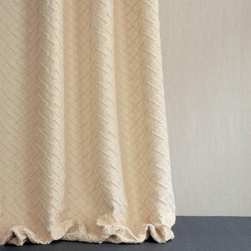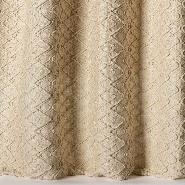 Created on a traditional crochet loom, Mahrama revisits the macramé technique. The threads are knotted, intertwined, drawing a slightly openwork geometric pattern.