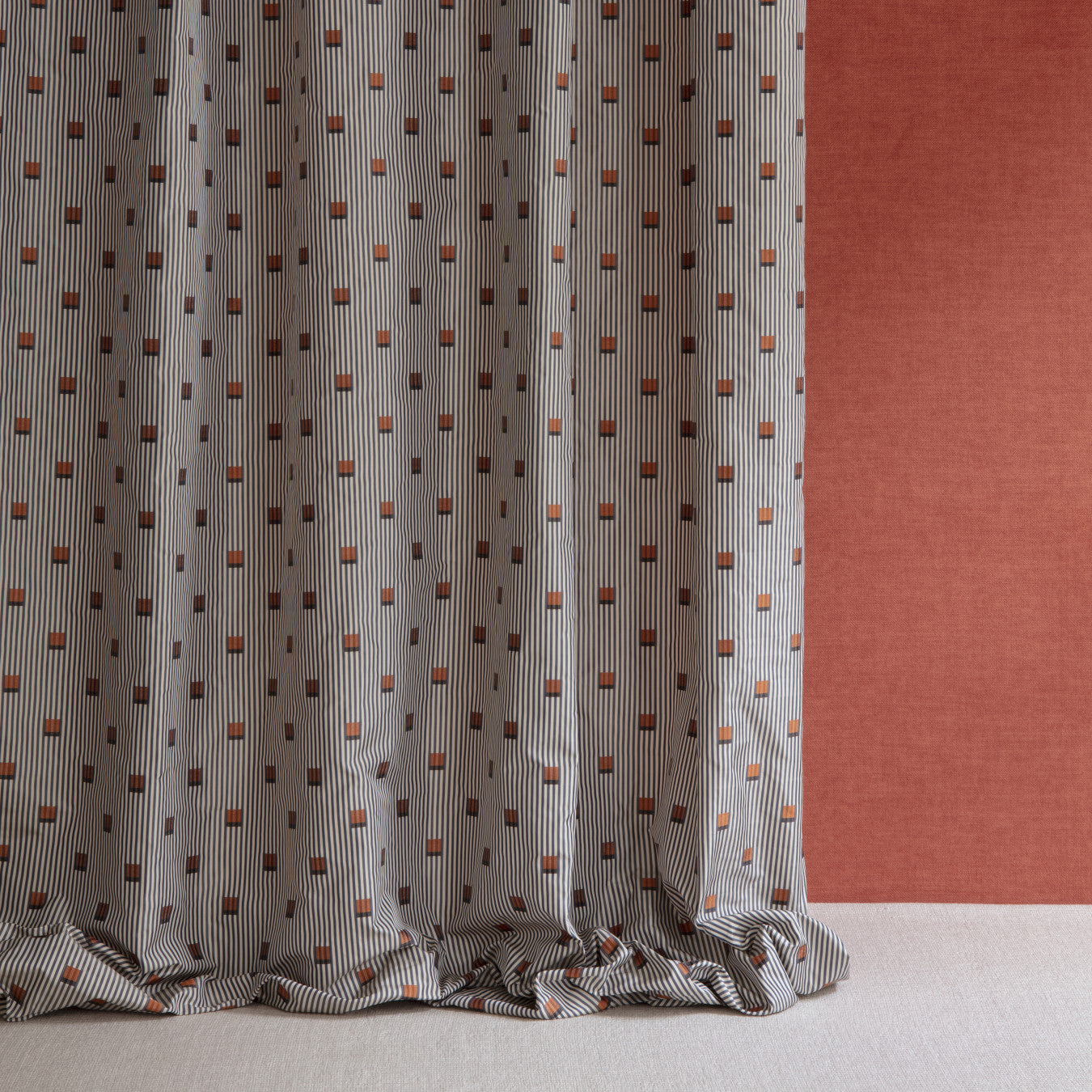 Description: Urban inspiration for this fine two-tone stripe, dotted with small two-tone cut-out squares. The finesse and liveliness of the taffeta give Shima an exceptional touch and drape.