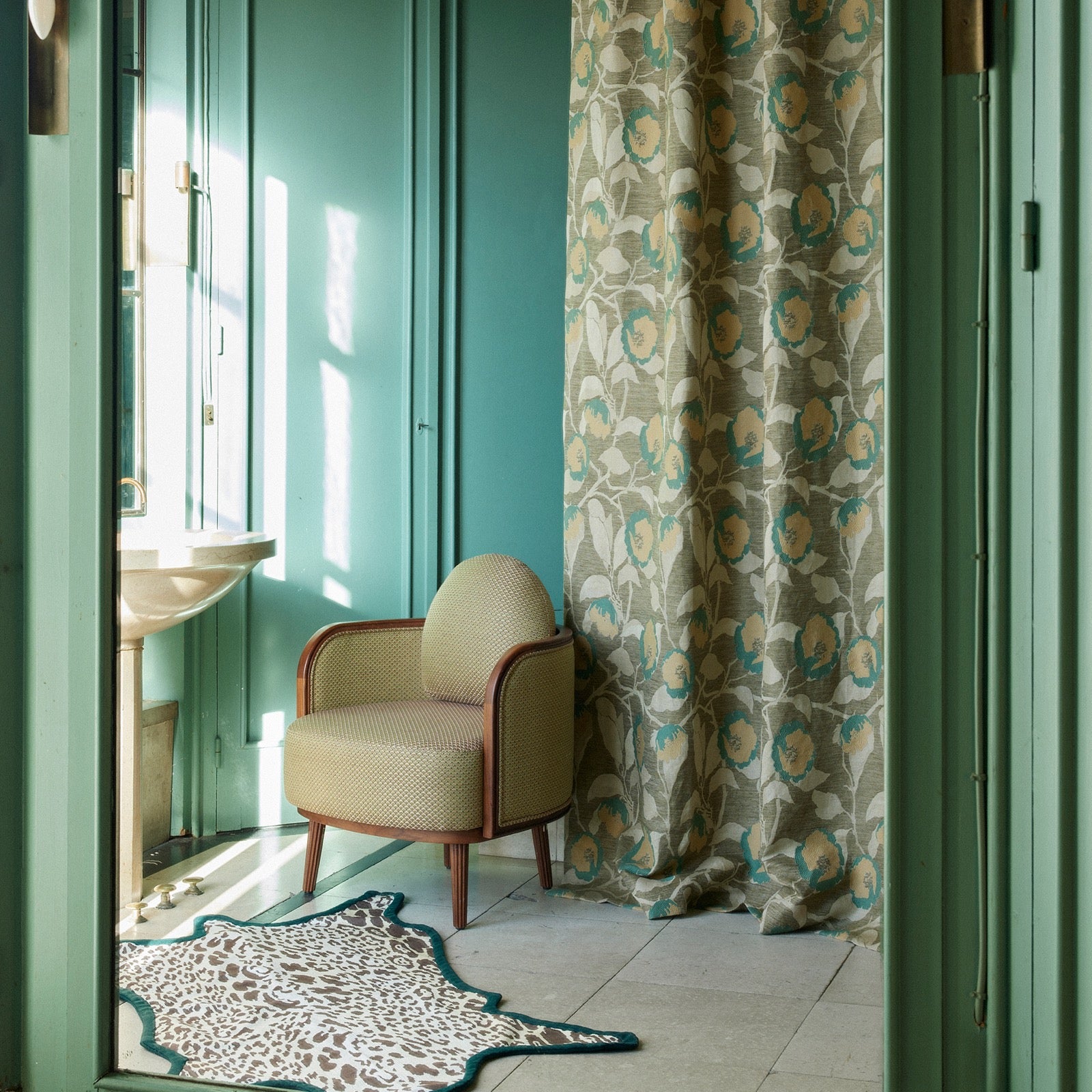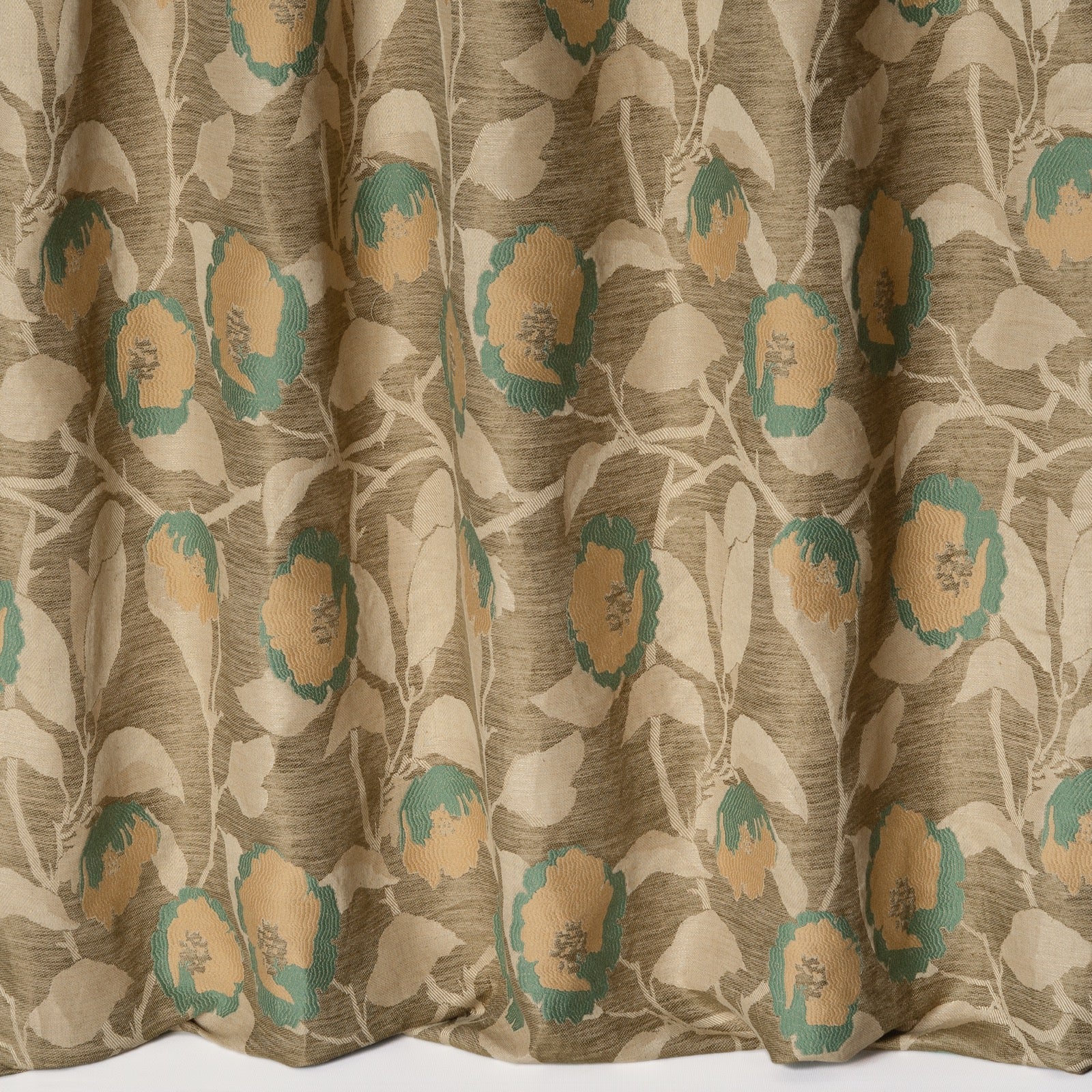 Details: Virginia is a sublime linen jacquard with a sumptuous hand and an impeccable drape adorned with a forceful vegetal décor, influenced by the stylized and toned down colours of the 20th century Bloomsbury Group.