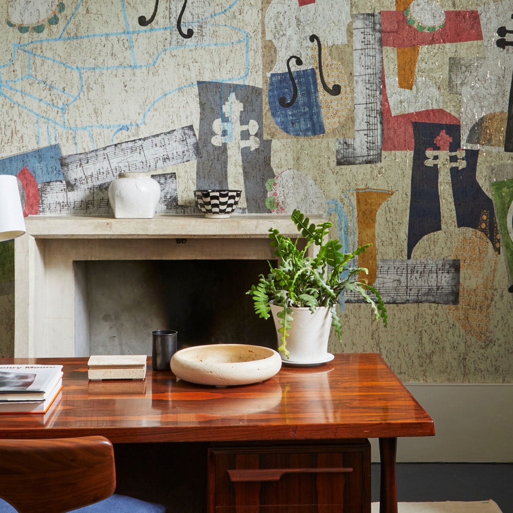 Details: A cubist-inspired interpretation of musical instruments dances across the surface of this striking panel - wind instruments are defined by paper cut out shapes and charcoal, a grand piano delineated by thick chalk marks and all combine together to create something full of life and music.