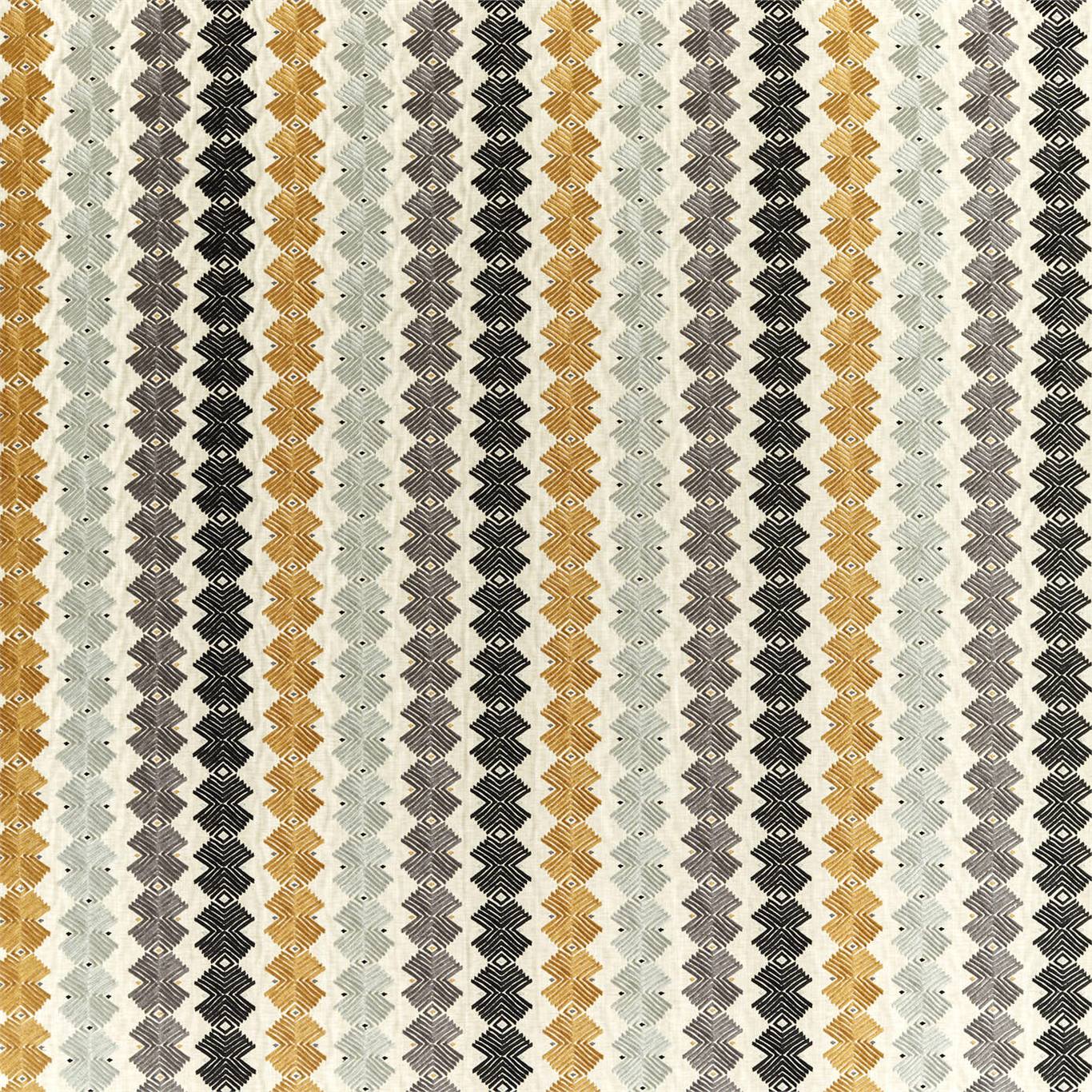 Tribal inspired shapes feature on this vertical geometric to create a striking drapery fabric. A wonderful colour carrier of contrasting shades the design’s viscose threads introduce a slight iridescence across the embroidery which contrasts with the natural ground.