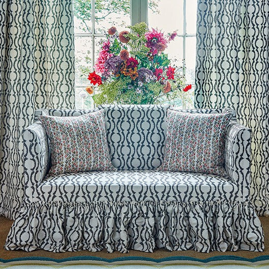 Description: The working name for this simple design, stuck with it, reflecting its playful character. The familiar ’Ogee’ layout is given a graphic edge with feathered motifs. ‘Zogee’ works beautifully as a coordinate to many of Madeaux’s most iconic designs or as a stand alone fabric in a scheme, richly layered with woven textiles and textures.