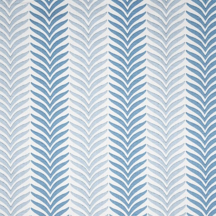 Details: Two toned delicate leaf motifs form alternating stripes across the fabric, each shape is carefully outlined with hand rendered dots to give a three-dimensional effect. Printed on a herringbone ground.
