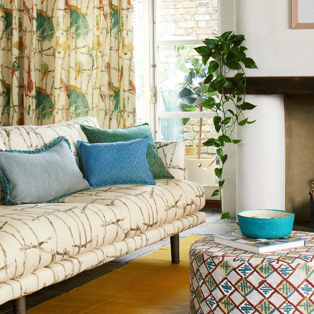 Details: The patchwork of sticks and branches that make the rustic trellis on which the "Exotic Birds" sit is produced here bird-free. Matching in colour, scale and groundcloth, combining the two patterns should inspire some wonderful decorative schemes.