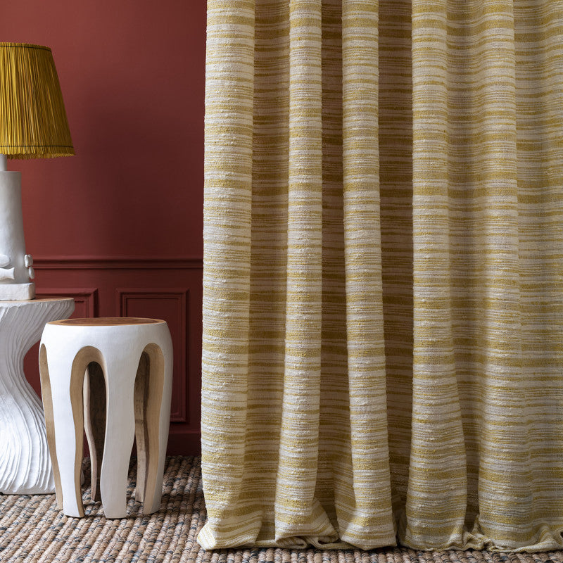 Description: The raw strands of our sheer Egee create pastel bayadères, offering a delicately irregular sheer, oscillating between seventies and Antiquity.