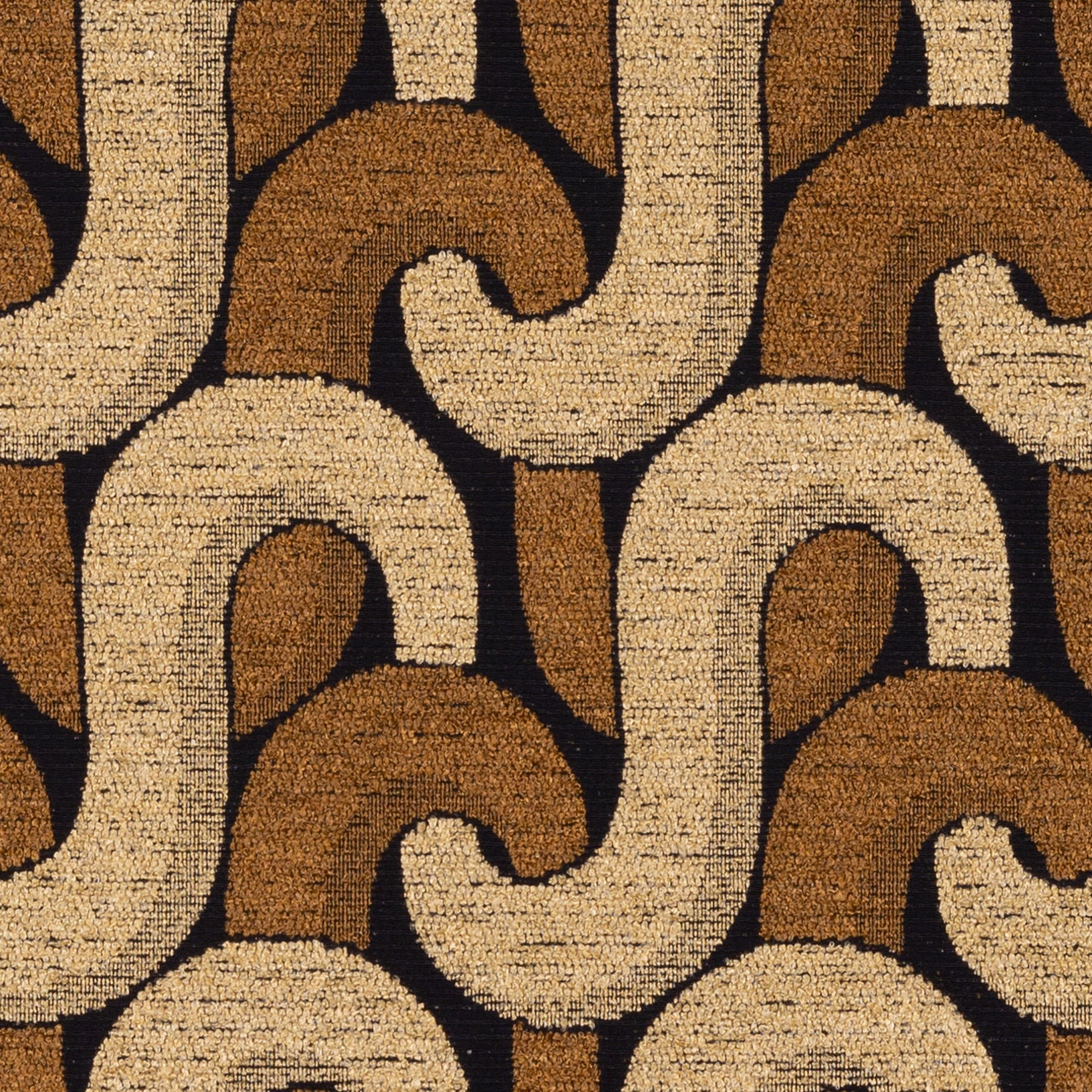 Description: On this seventies-inspired jacquard, sinuous lines intertwine and come alive. Its coloured bouclé contrast with the elegant black satin background.