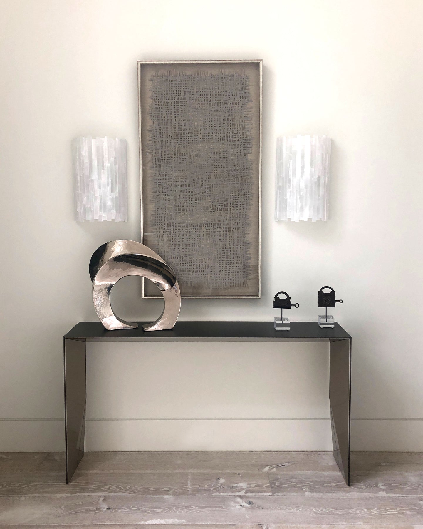Details: Selenite shards attached to a acrylic half cylinder. Single LED strip from top to bottom covered with a diffuser. Universal mounting bracket supplied