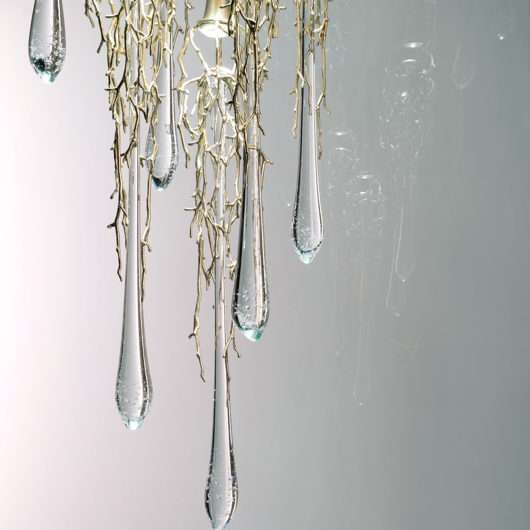 Pure and dazzling, the Liquid collection presents itself intentionally as a dense design. The vast branched pattern surrounds a considerable sized glass piece just as an embrace of nature, where the movement of the structure tries to reach the fall of a drop of water. Due to the steel cable solution, the Liquid collection is ideal for situations that require some structure and magnificence, achieving a status of lighting sculpture.