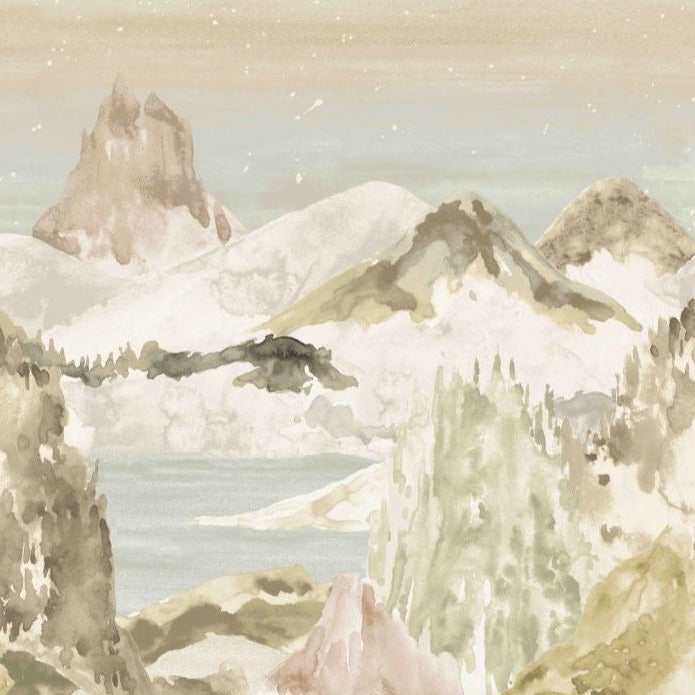 Details: Broad watercolour washes of an abstract and magical landscape of lakes and mountains suggest something other worldly. The soft neutral colourway is restful and dreamlike, the dark colourway includes a sky with elements from the galaxy, perfect for a striking and glamorous space. Both colourways are available on the pearlescent ground which further enhances the ethereal effect.