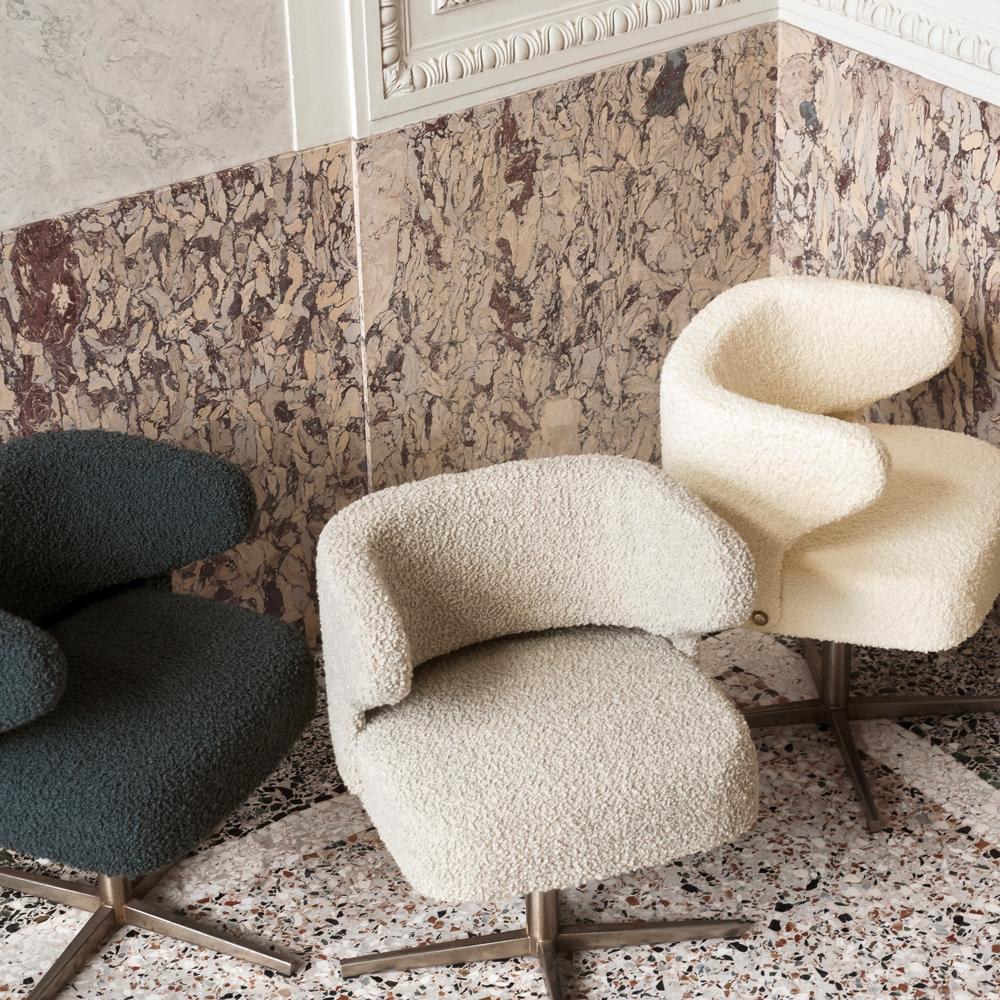 Description: A soft wool boucle fabric reminiscent of puffy clouds. An uneven surface and textural richness are the distinctive features of this fabric. The delicate colour palette, including natural tones and darker shades, enhances the intrinsic nature of wool.